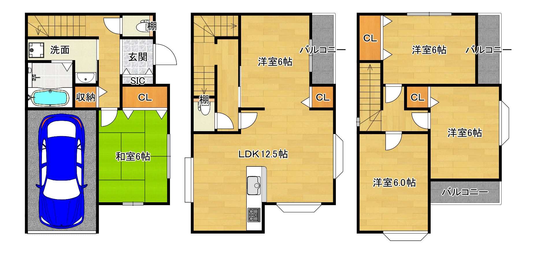 洋室6.0畳 1階 洋室6.0畳 2階 LDK12.5畳 2階 洋室6.0畳 3階 洋室6.0畳 3階 洋室6.0畳 3階 |